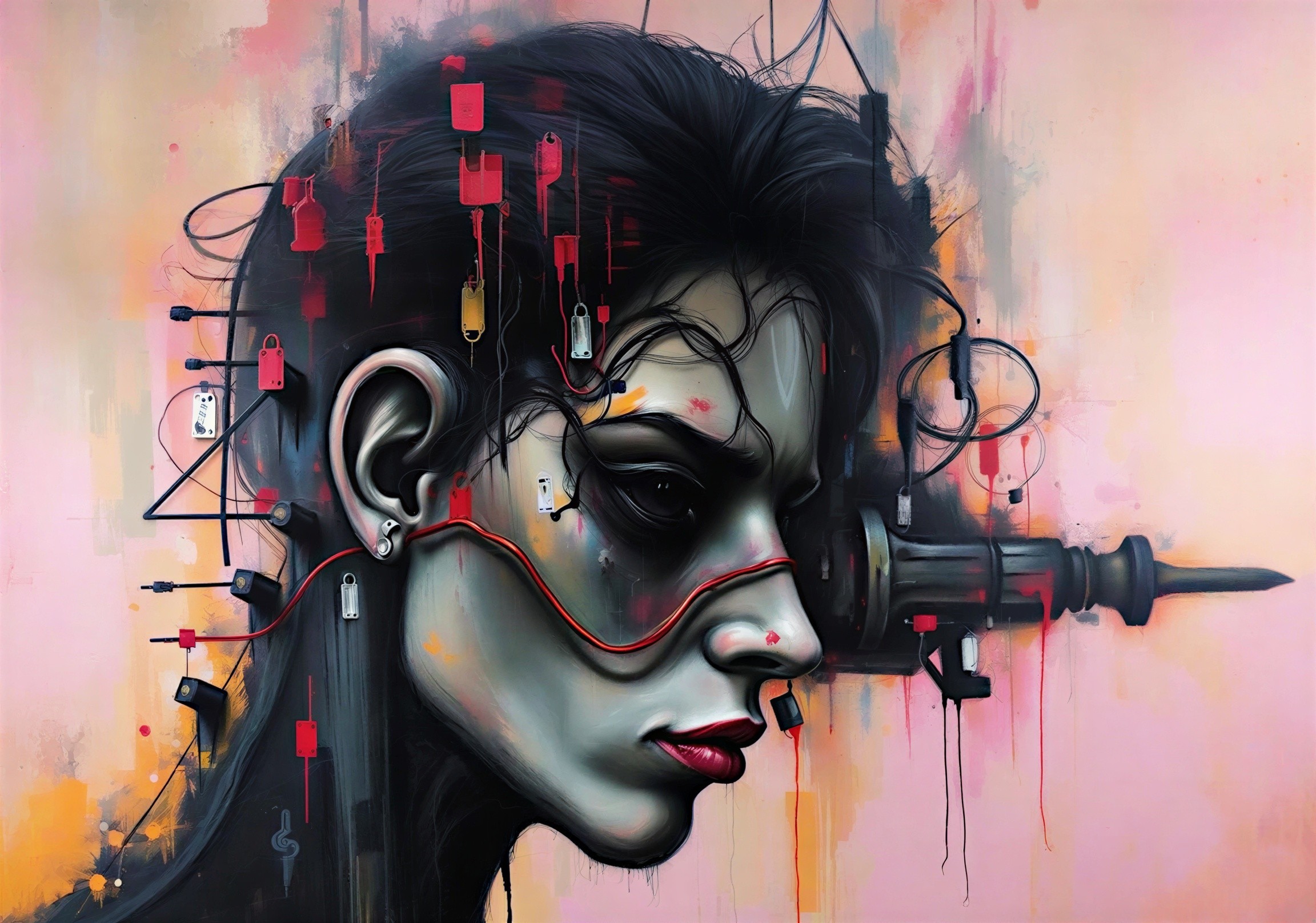 Prompt: Light blue and pink wet ink colors Dreamy beautiful woman with an umbrella on a winter evening with many lace figures on a black canvas depicted in the perfect fractal style of Wassily Kandinsky, Jackson Pollock, Alphonse Mocha and Jeremy Mann, Meta, 4K