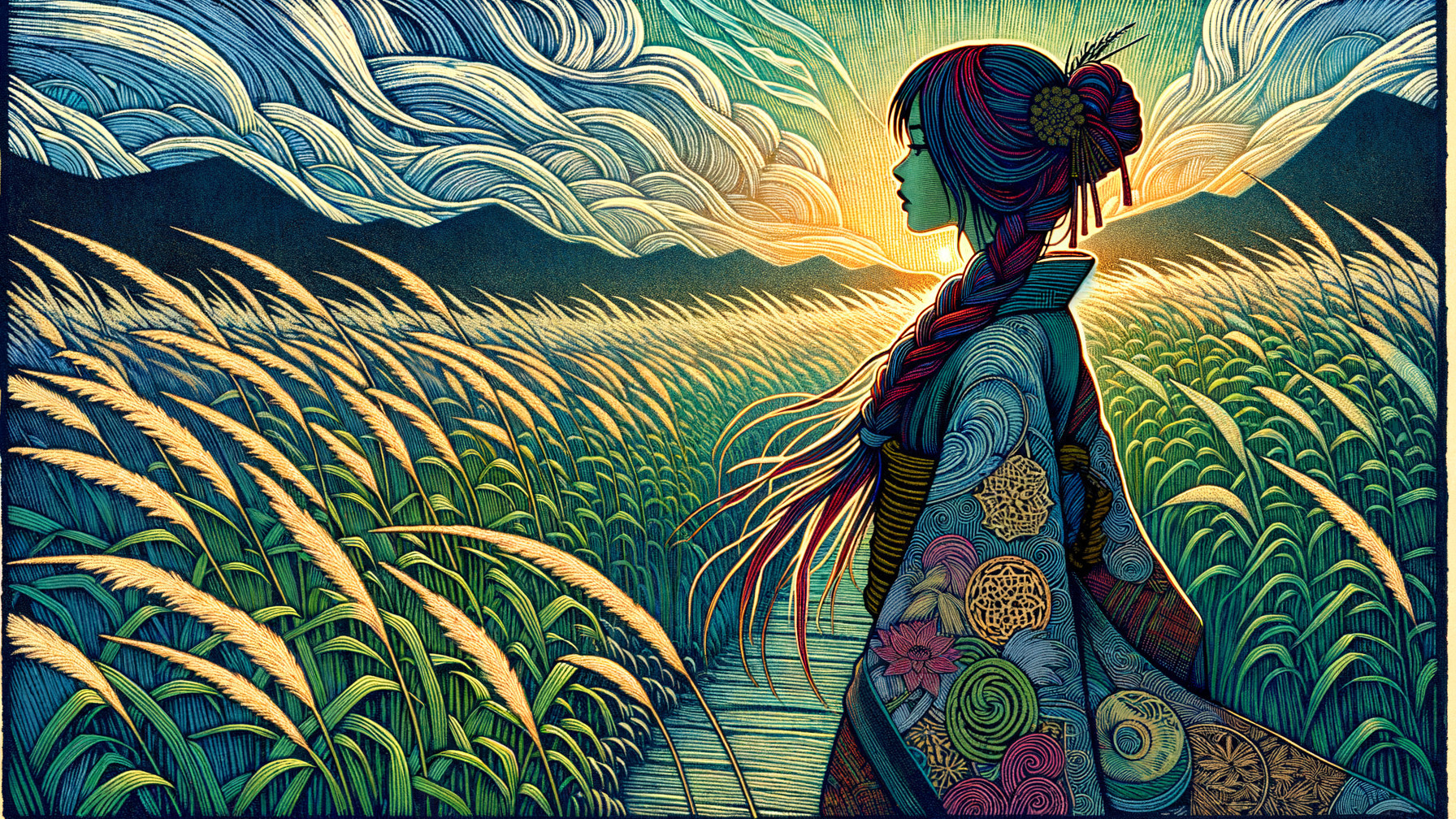 Prompt: Masterpiece, a 16:9 format of a painstakingly crafted, extremely detailed, multi-layer woodblock rendering on rough handmade paper, partly complemented by wet watercolor. This exquisite Japanese folio presents an impressionist scene, infused with the poetic spirit of the Ogura Hyakunin Isshu. A young woman is the focal point, rendered with sharp focus and intricate, graceful detail. Her long, braided hair cascades over her shoulder, each strand a fine, expressive ink line interwoven with vibrant streaks of crimson and deep indigo. She wears a kimono whose intricate patterns add profound depth, rendered with a zentangle-like precision of repetitive, beautiful motifs. She stands in an outdoor meadow that glows with touches of yellow, green, and blue, executed not with broken brushstrokes, but with the painstakingly detailed, layered application of woodblock printing. The field of bamboo grass around her is bent by a steady wind, its repetitive patterns showcasing the perfect medium of the woodcut in beautiful shades of green and tan. The sky is filled with vaporous, textured clouds in pale blues and whites, created through multi-layered printing. On the horizon, in the distance, lies Mount Arima, a steadfast presence. The dynamic lighting reflects gently on her skin, creating subtle, iridescent highlights and a luminous atmosphere. Forms are suggested through the deft execution of the woodcut's airy contours, evoking a sense of movement in the light. The overall composition is a peaceful, poetic summer moment, a masterful play of color, light, and atmosphere that evokes a deep feeling of solitude, thoughtfulness, and unwavering memory. Award-winning, ultra-detailed, and rich in color, it is a testament to an old master's technique.