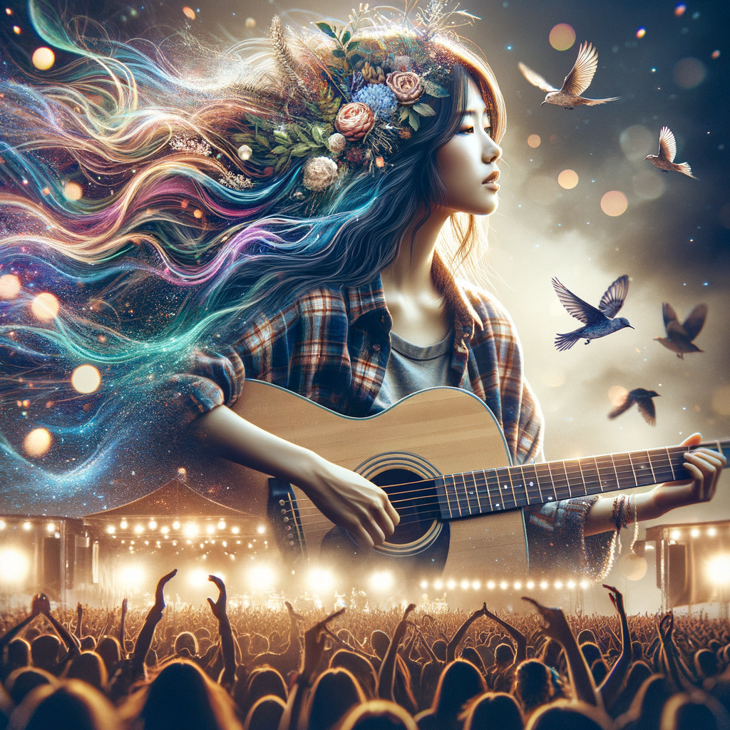 Prompt: Double exposure artwork of an Asian girl playing an acoustic guitar blended with a large music festival crowd. Close-up profile of the girl, calm and focused expression, soft features, long flowing hair with multicolored highlights and subtle floral elements woven into it. Her hair moves naturally as if in a gentle breeze. She wears a plaid shirt and casual, earthy-toned clothing. Fine glowing particles surround her, giving a dreamy, artistic atmosphere.