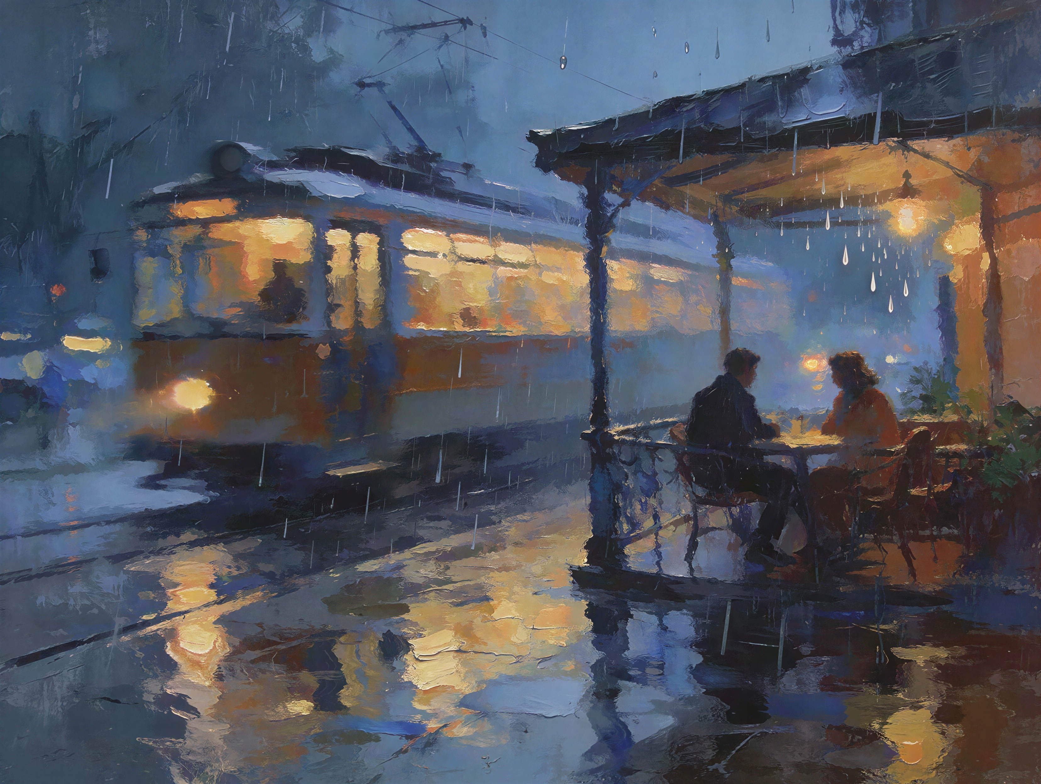 Prompt: Vivid digital artwork masterpiece, woman transitioning from torn newspaper reality to vibrant rainy world, grayscale newspaper pages torn and crumbling, realistic paper texture, subtle ink bleeding, faintly legible headlines and text, chaos, change, or transformation stories, deep blue and red ombre dress, warm beige skin tone, flowing fabric with digital oil painting brushstrokes, dark brown hair flowing with loose strands framing face, vibrant rainy world background, neon city lights reflecting on wet pavement, glowing puddles, blurred rain streaks, cityscape silhouette against colorful sky, surreal atmosphere, digital art with hyper-realistic details, dynamic lighting effects, by Escher and Dali, ArtStation, 4K resolution.