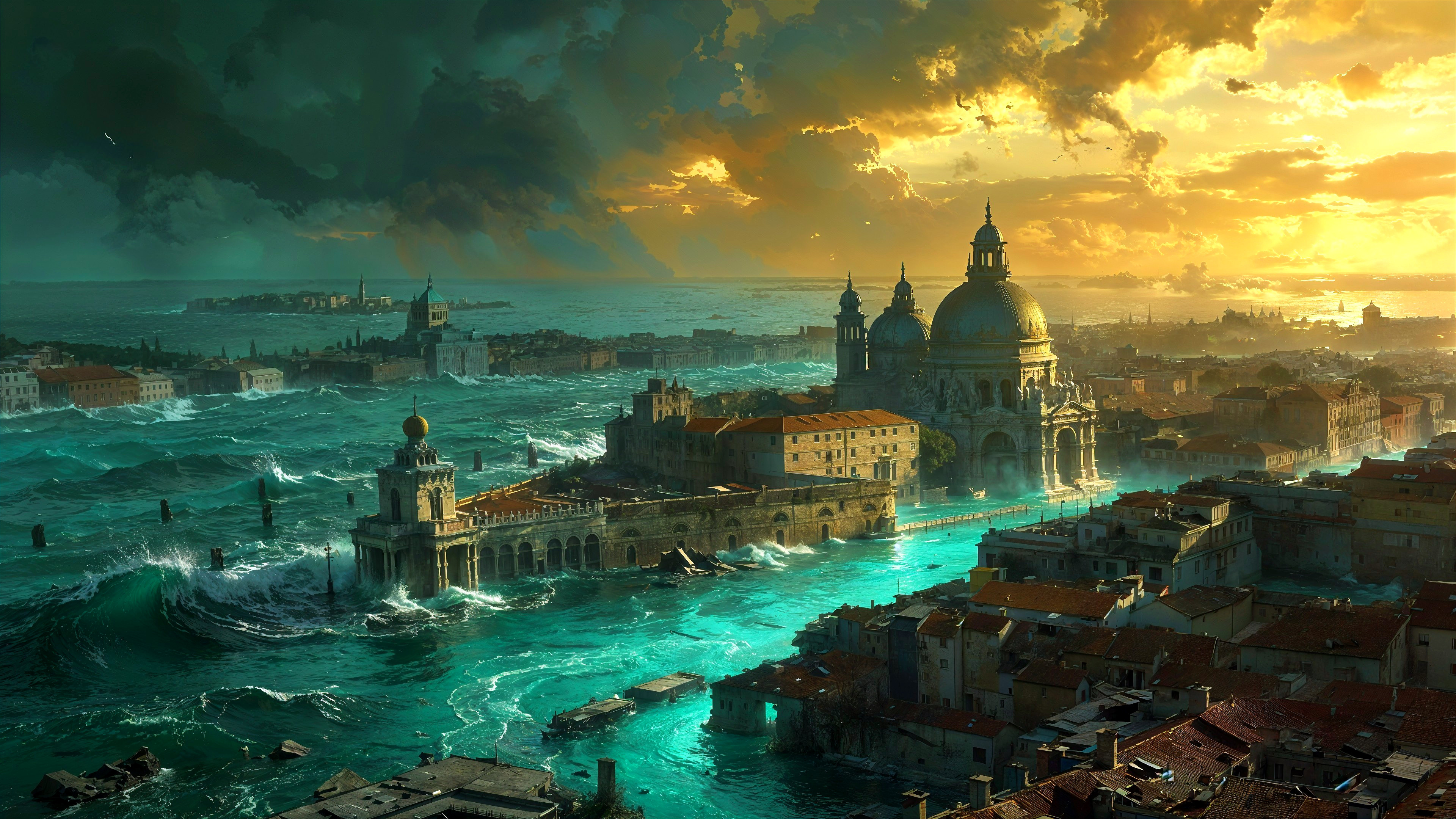 Prompt: Aerial view of a flooded ancient city, rooftops and church towers rising from raging turquoise waters, streets turned into canals. Dramatic sky, golden twilight light contrasting with destruction. Post-apocalyptic atmosphere, cinematic painterly style, teal and gold color palette, rich textures, wide-angle, poetic realism.