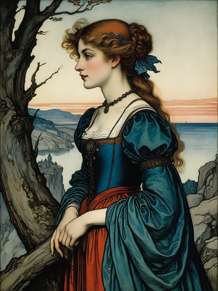 A young woman stands by a tree, gazing thoughtfully into the distance. She wears a striking blue and red dress, with her hair adorned by a ribbon, against a serene landscape at dusk.