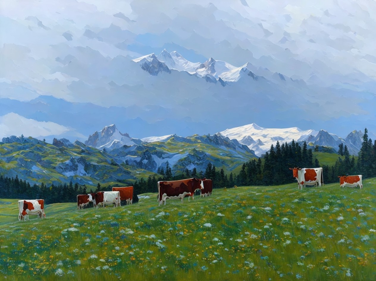 A serene landscape painting featuring cows grazing in a lush green field with majestic snowy mountains in the backdrop under a hazy sky.