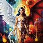 A striking fantasy illustration features a dual-character woman, part angel with white wings and part demon with black wings. Her split form symbolizes the balance between light and darkness.