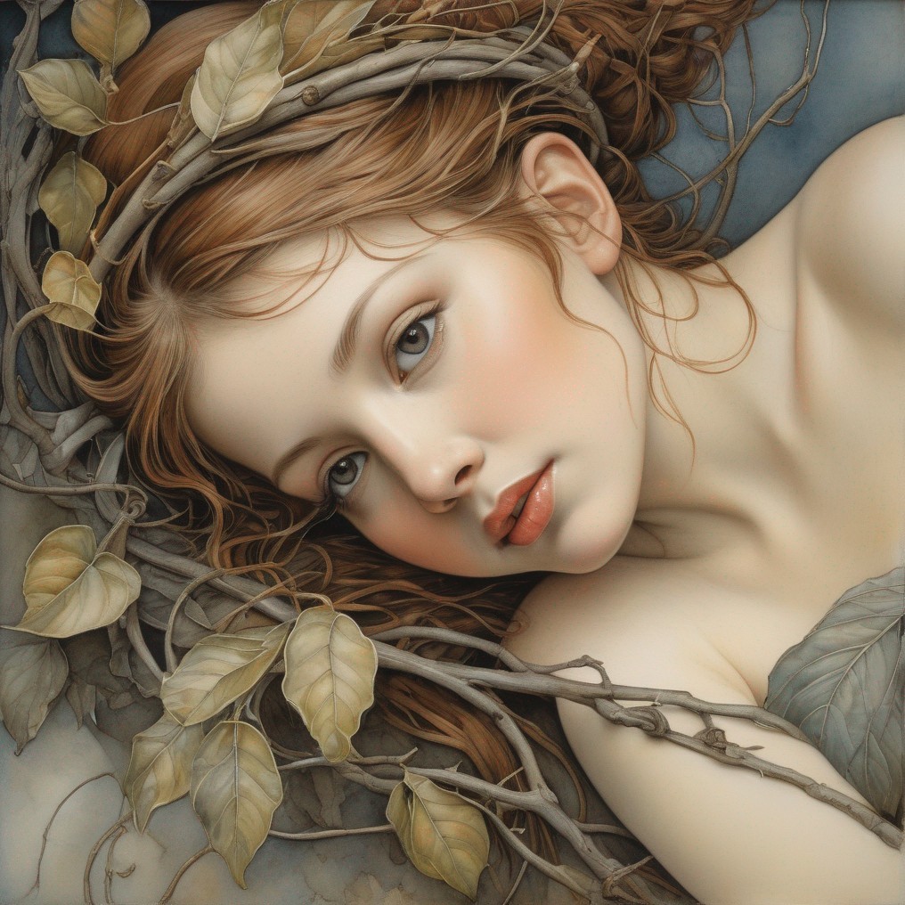 A painting of a girl with a wreath on her head, surrounded by leaves, showcasing intricate, lifelike details and warm tones.