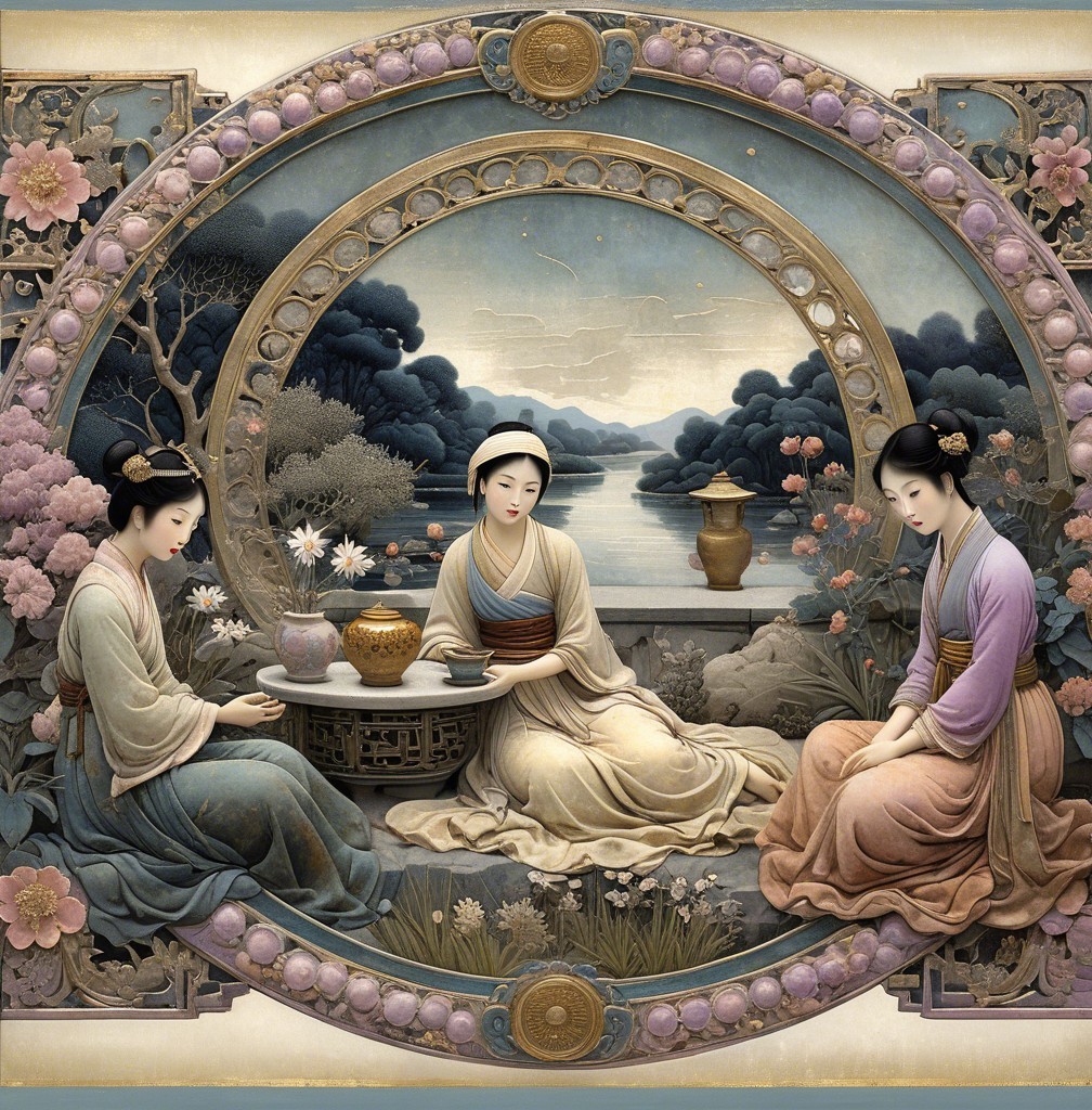 Girl in a beautiful garden, 3rd century Chinese miniature art, Velvet blush sky blue, sage, lavender, Shabby, Dull Gold, Amber Gray, marbled. dramatic