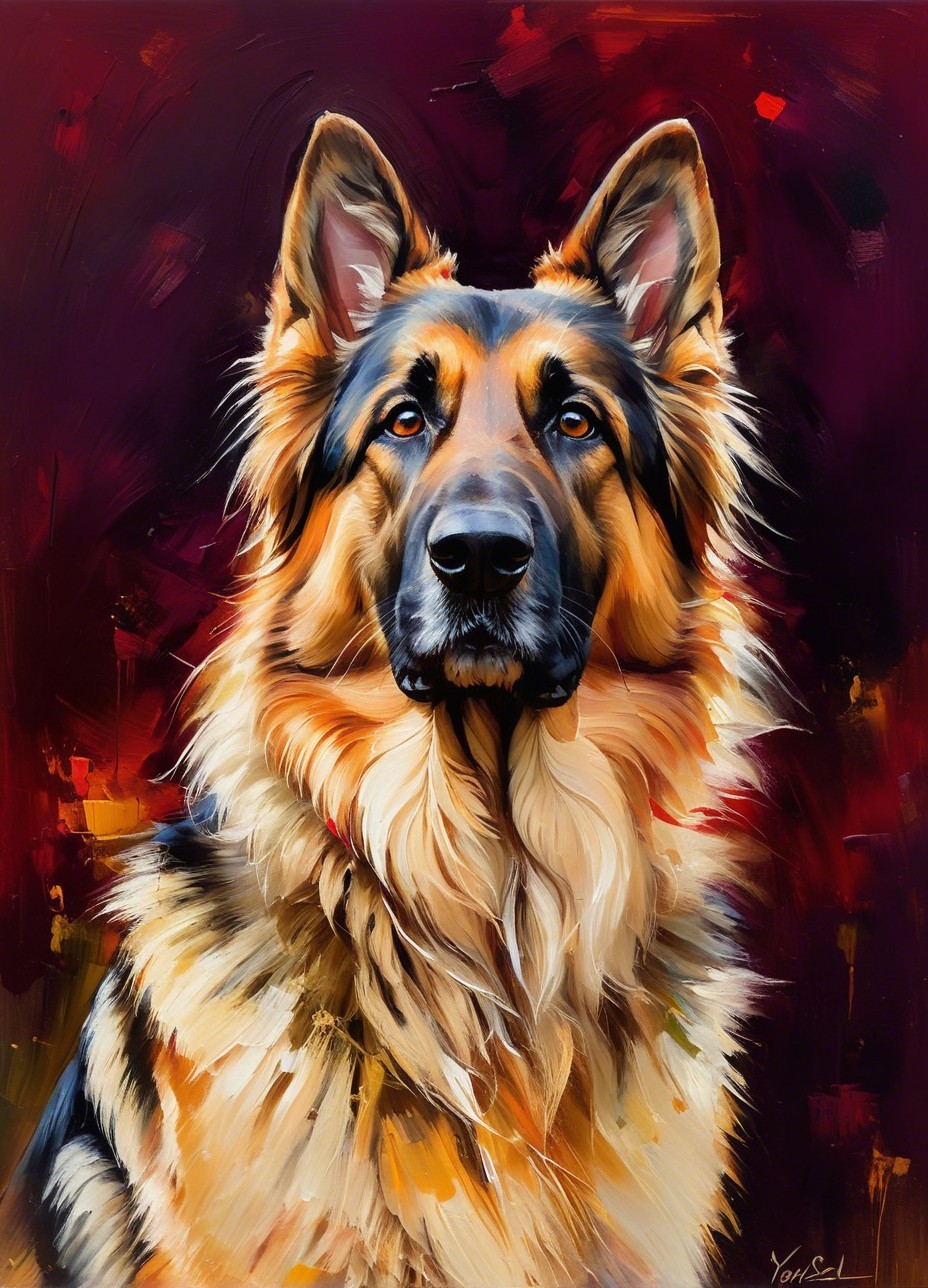 A majestic German Shepherd with a vibrant, fluffy coat stands against a backdrop of autumn leaves, exuding elegance and loyalty. Its expressive eyes capture a sense of intelligence and warmth. Prompt (revised) by SiouX!