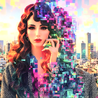 A vibrant portrait of a girl with long, flowing hair, adorned in a colorful floral outfit. Behind her, a radiant sun and scenic landscape with mountains and rolling fields enhance the striking imagery.
