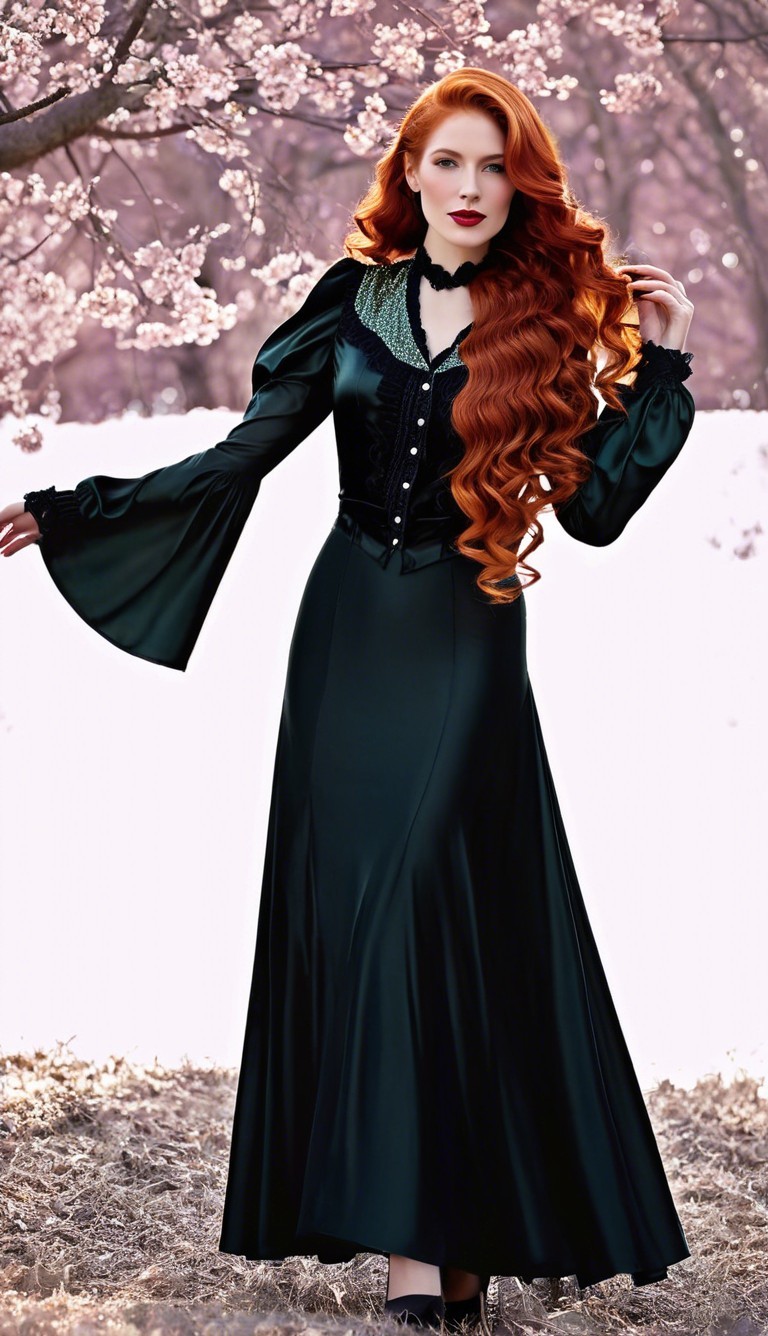 Prompt: Vibrant red hair flowing in sleek, curly waves, each streak is gleaming with reflections, harmonizing with the iridescence of the background. The woman's Edwardian blouse and a crackled garment are seamless, blending with her vintage allure, emitting a captivating ethereal glow.Her satin dress intricately designed with tiny metallic parts and metallic ornate, exuding an energy that enhances her gothical aesthetic. Multi-layered eyes show a deep, piercing shade of red, captivating and intense. The smooth, textured surface of her skin is shining beautifully, complementing the tessellated flow of her hair, creating a seamless blend of nature and beauty. Her expression exudes uplifting confidence, embodying a fusion of strength and grace. The backdrop features a iced lake and a stylized winter landscape with pale blossoms, intricately detailed like icy celestial jewels, saturated in hues of purple, pink, and auburn, adding depth and dimension to the scene. The art style encompasses divisionism and maximalism, radiating a vibrant aura. Subtle elements like floating flares and shimmering reflections play with light and shadow, enhancing the visionary depth of the composition. Rim lighting adds a touch of visionary depth, enriching the overall visual impact.This visually striking composition is rendered in 8k resolution, utilizing HDR to bring out the vivid colors and intricate details. The use of a Canon EOS R5 with a 135mm lens ensures a sharp focus and depth of field, capturing stunning beauty and harmonious aesthetics. Parallax occlusion 1.2 ,stylization by Georgia O'Keeffe and benno hauber, hues by freda people, full body portraiture in saturated colors 1.7, foampunk 1.4, hallucinatory, sculpted, cel-shaded, dethereal, detailed branches, trans-Avantgarde reference, stacked-up perspective, hues by Georgia O'Keeffe, colored spaces, overall stylized illustration