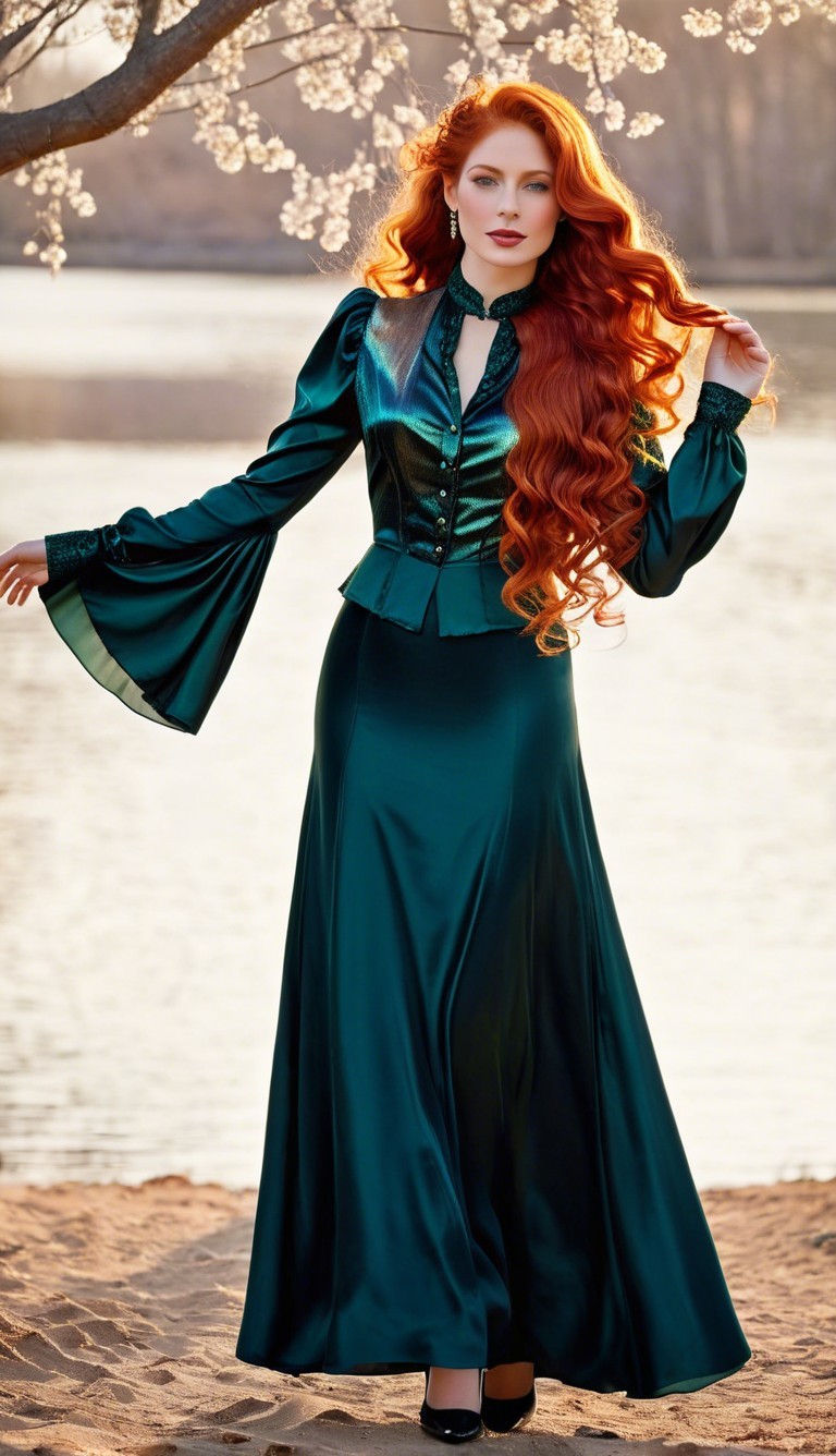 A woman with long, flowing red hair stands gracefully by a serene body of water. She wears a stunning, emerald-green satin gown with elegant, billowing sleeves, exuding vintage charm.