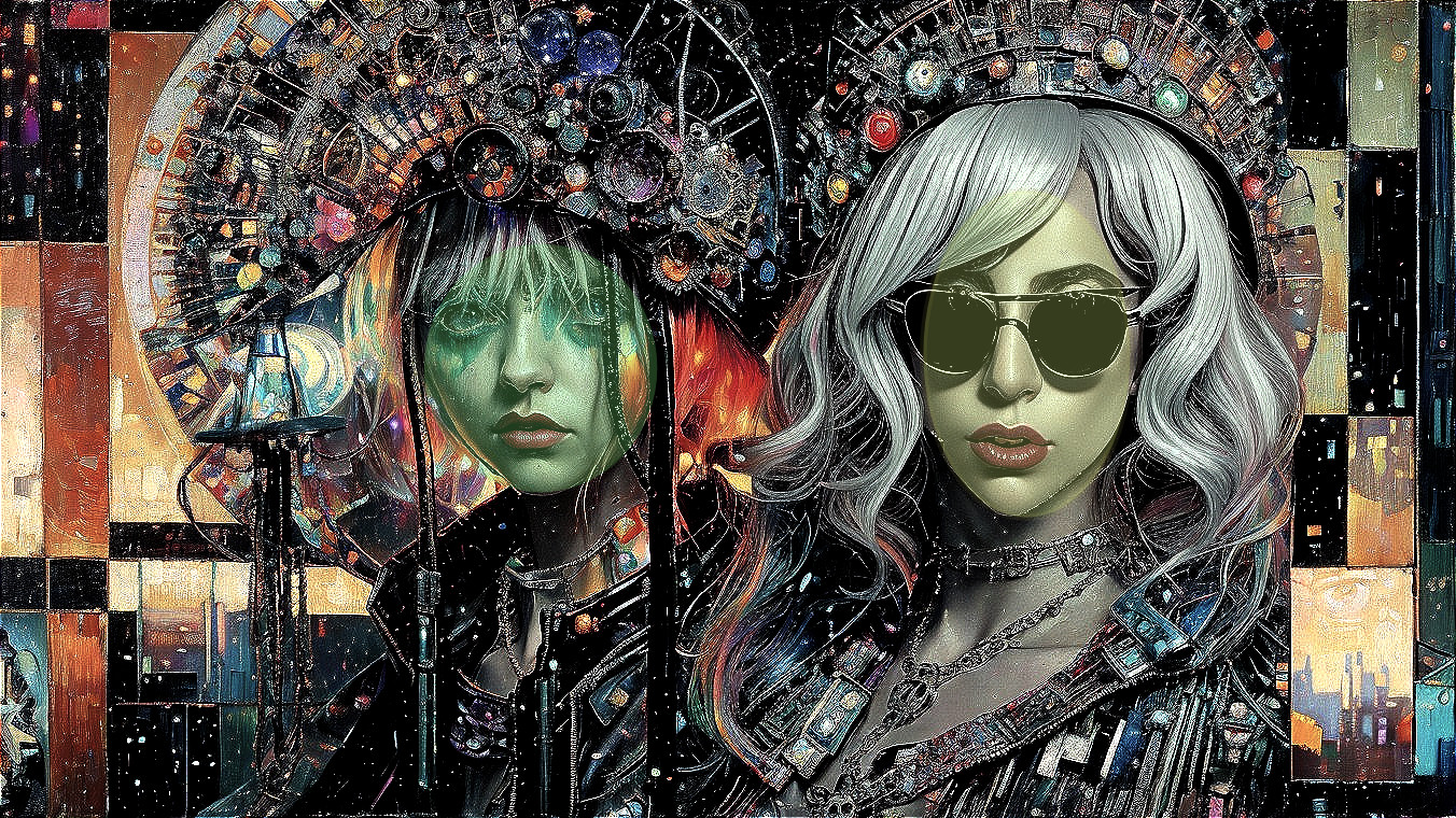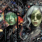The image features two women with striking features, adorned in futuristic attire and intricate headgear. Their surroundings blend vibrant colors and geometric patterns, creating a sci-fi atmosphere.