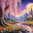 A serene landscape features a majestic castle by a tranquil river, surrounded by blooming flowers and towering mountains under a glowing full moon, evoking a magical and tranquil atmosphere.