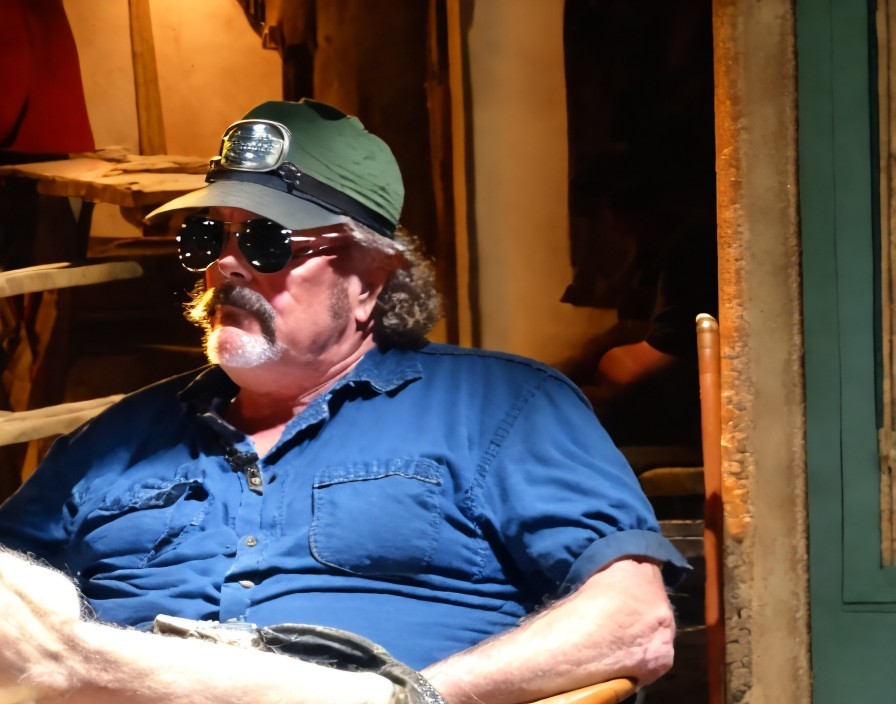 A man with sunglasses and a green cap is in focus upfront; another man, similarly dressed, sits out-of-focus in the background.