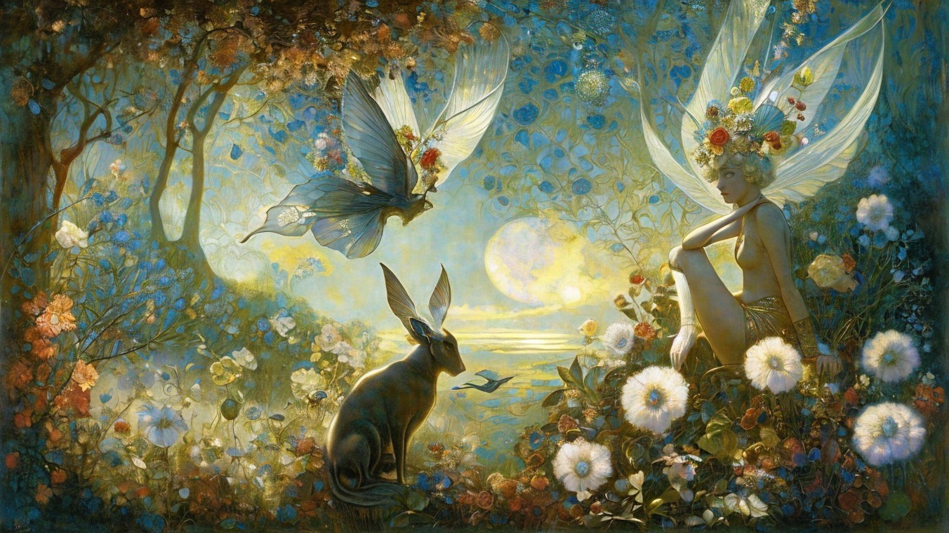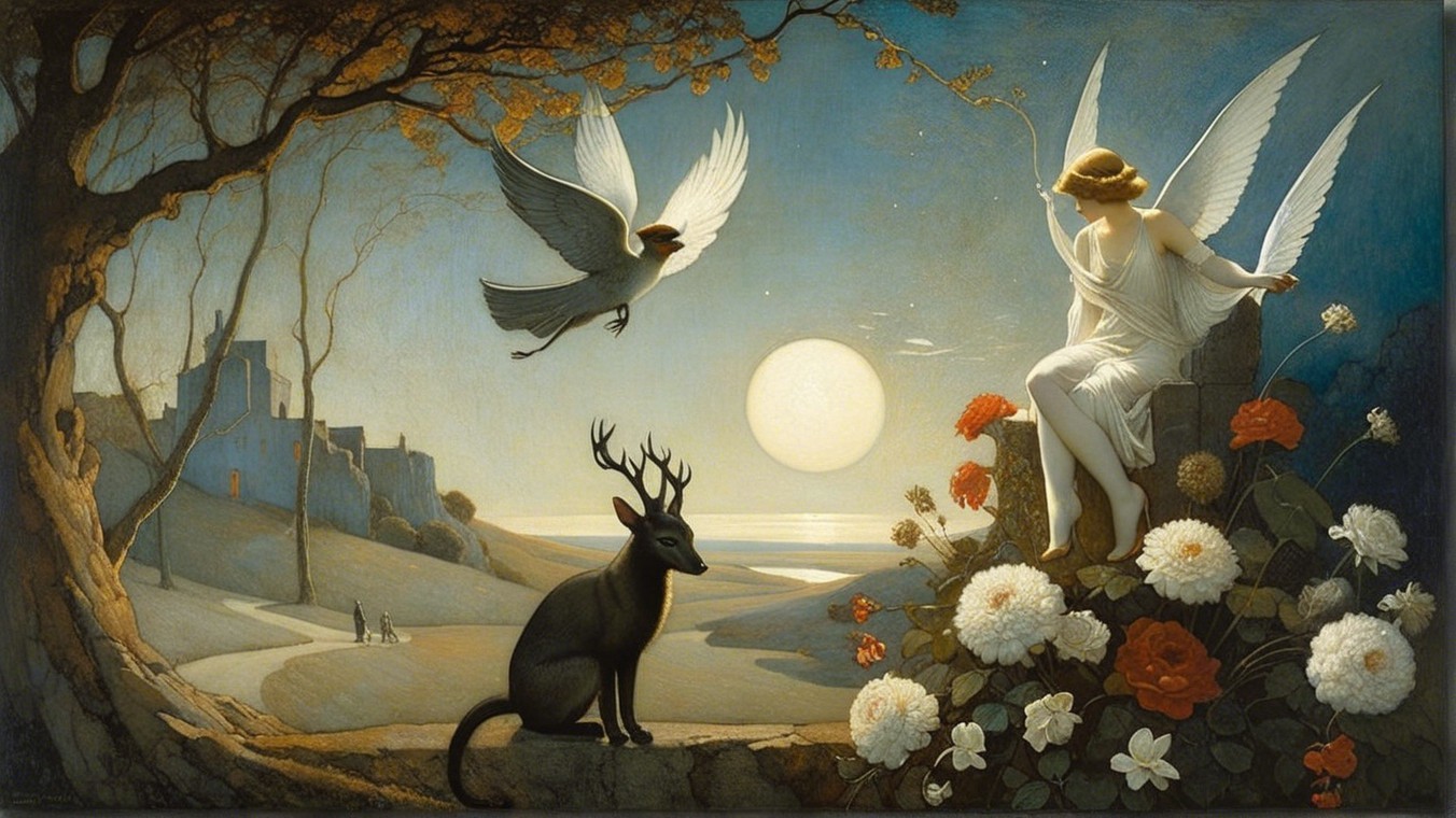 The artwork depicts a serene woman in a flowing white dress, seated beside a majestic moon. A black wolf and two birds join her, with a tranquil landscape of hills and distant houses.