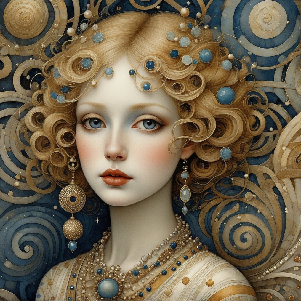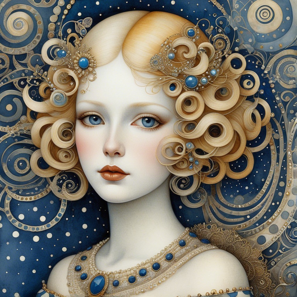 A whimsical portrait of a young woman with golden, curly hair adorned with blue flowers. She has pale skin and captivating eyes, set against a rich blue background featuring swirls and patterns.