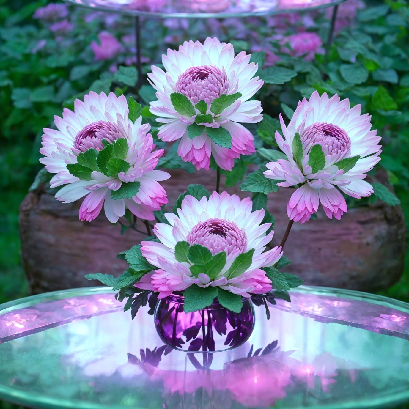A cluster of purple and white chrysanthemum flowers flourishing above a reflective glass surface among green foliage.