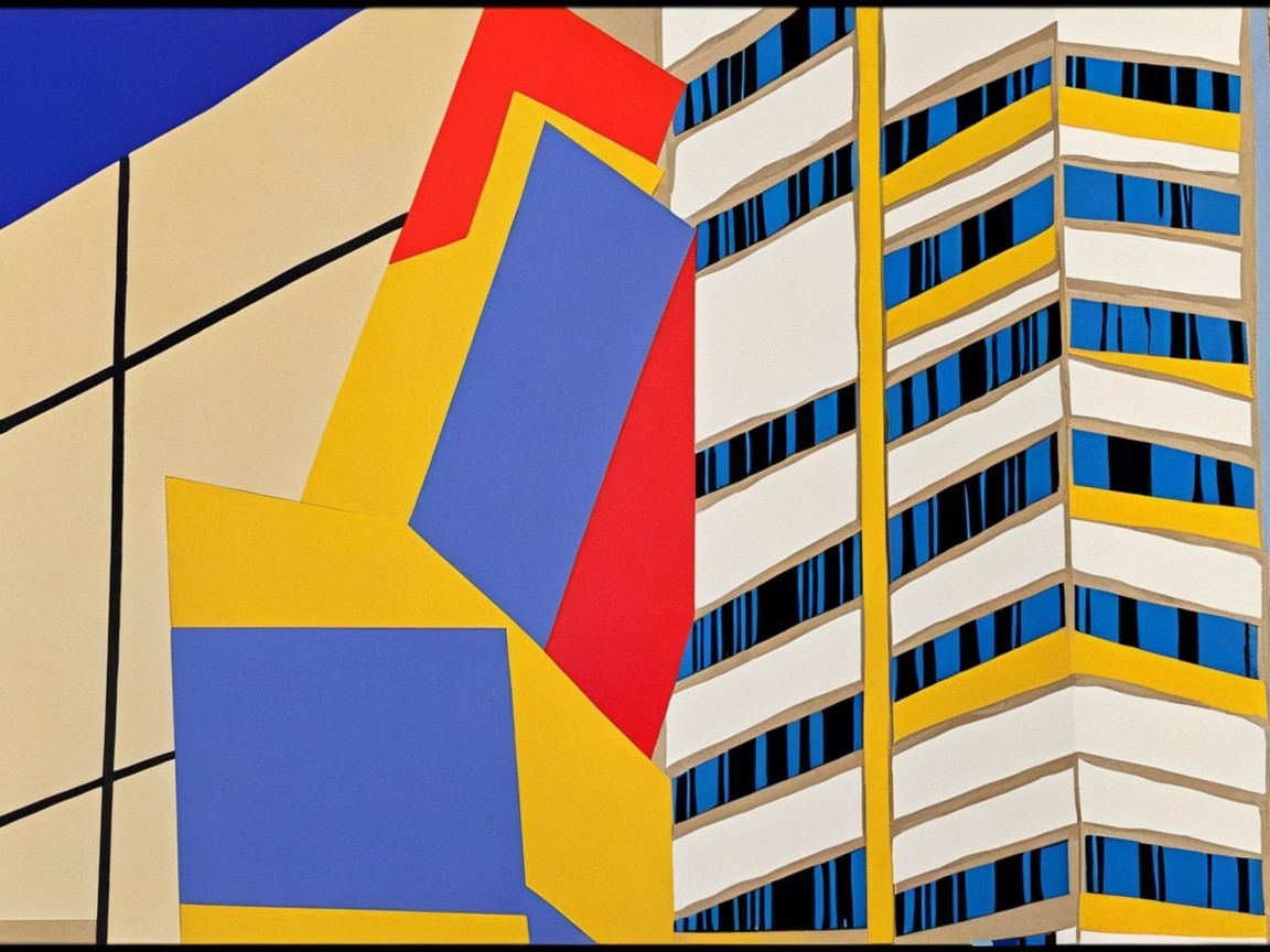 The image features a vibrant abstract composition with geometric shapes and bold colors. It combines elements of architecture and modern design, creating a visually dynamic and intriguing scene.