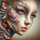 A vibrant portrait of a woman with intricate, swirl-patterned face paint in bold colors. Her large blue eyes and glossy lips draw attention, exuding an artistic and surreal quality.