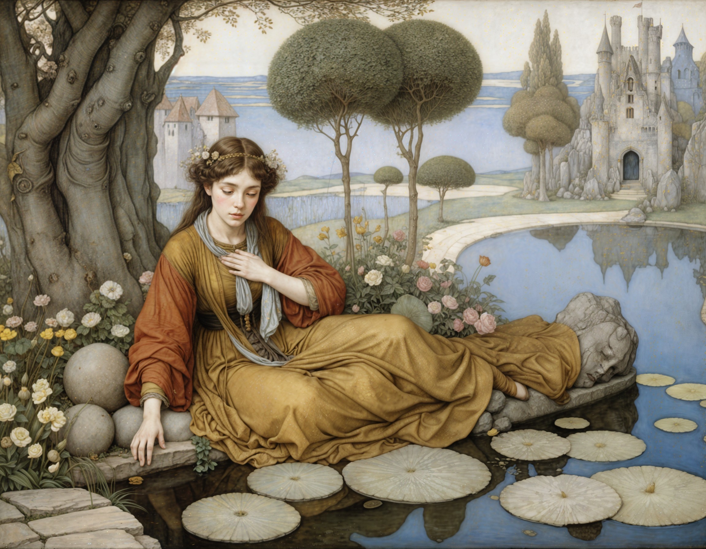 all sides sides view shots of a beautiful abrasive of the (cosmic magical mystical medieval garden:1.3), by (Arthur Rackham and Edward Deakin, Michael Parkes:0.8), (Tempera and depiction:0.8), 16:9, (painting: Anton Mauve and Enki Bilal Edward Gorey, junji ito, klimnt , gold leaf color, silver leaf color