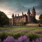 A majestic castle with towering spires stands amidst lush greenery and vibrant lavender fields, bathed in soft, warm light during sunset, evoking a fairy-tale charm.