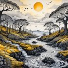 The scene depicts a serene landscape with a winding river surrounded by lush hills. Tall trees frame the view under a golden sunrise, while birds gracefully soar in the sky.
