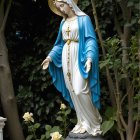 The image features a serene statue of the Virgin Mary, draped in a blue and white robe, with hands clasped in prayer. A gentle halo of light surrounds her, set against a backdrop of lush greenery.