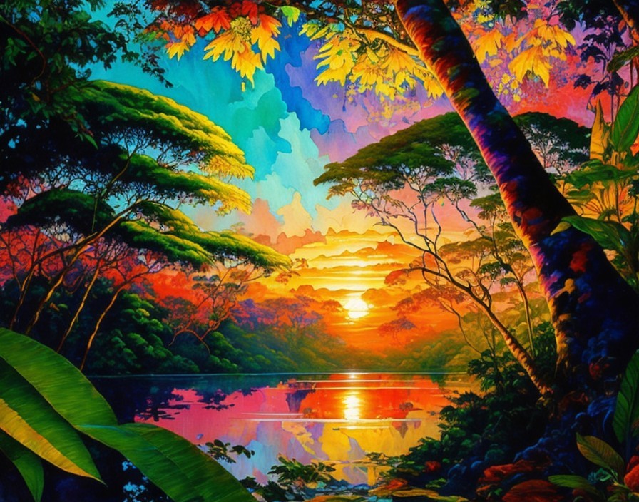 3D watercolor, fantastic wide view, spectacular sunrise over a beautiful Tingatinga style Rainforest jungle river, satiny, high quality, shimmering, elegant, with vibrant saturated colors, elegant, highly detailed, glistening magic style, by Alphonse Mucha