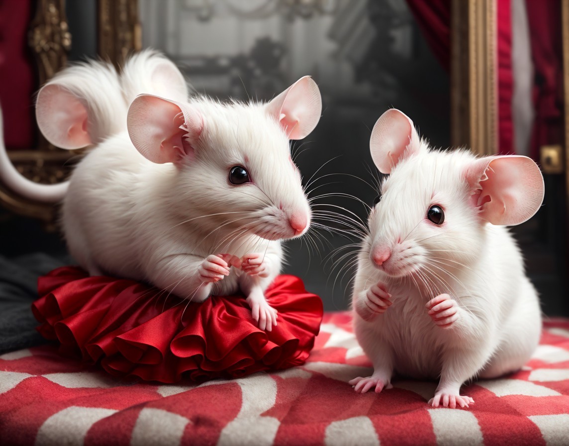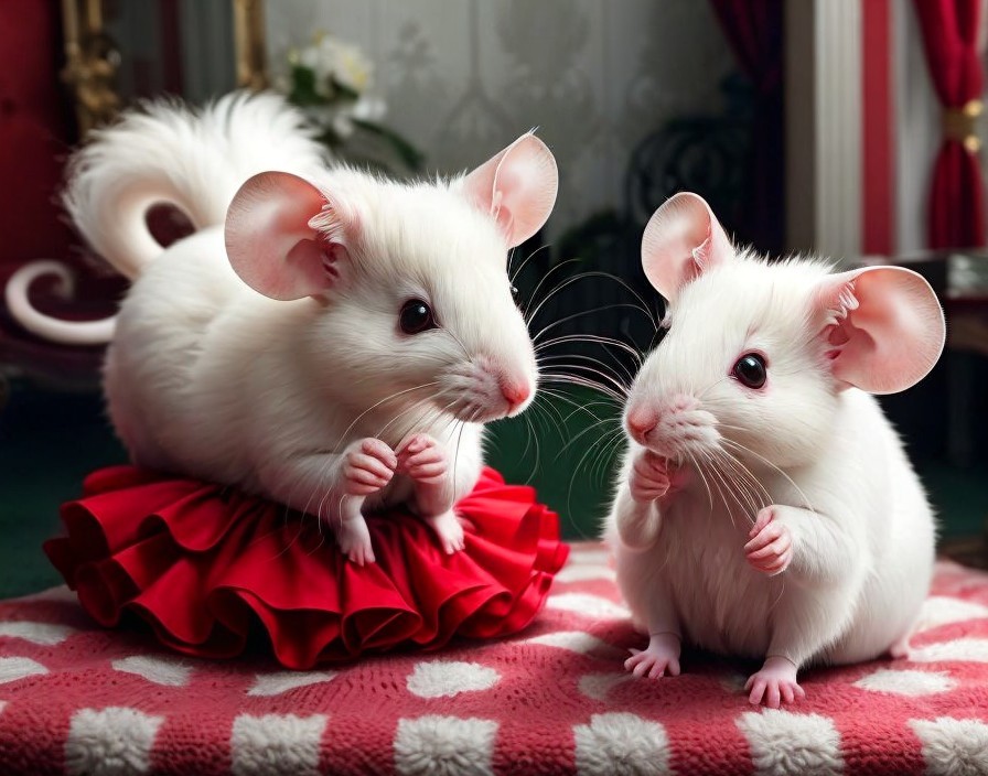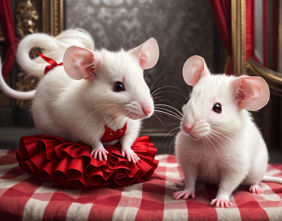 Two white mice with a whimsical appearance dressed in elegant attire posed in a rich, classic interior.