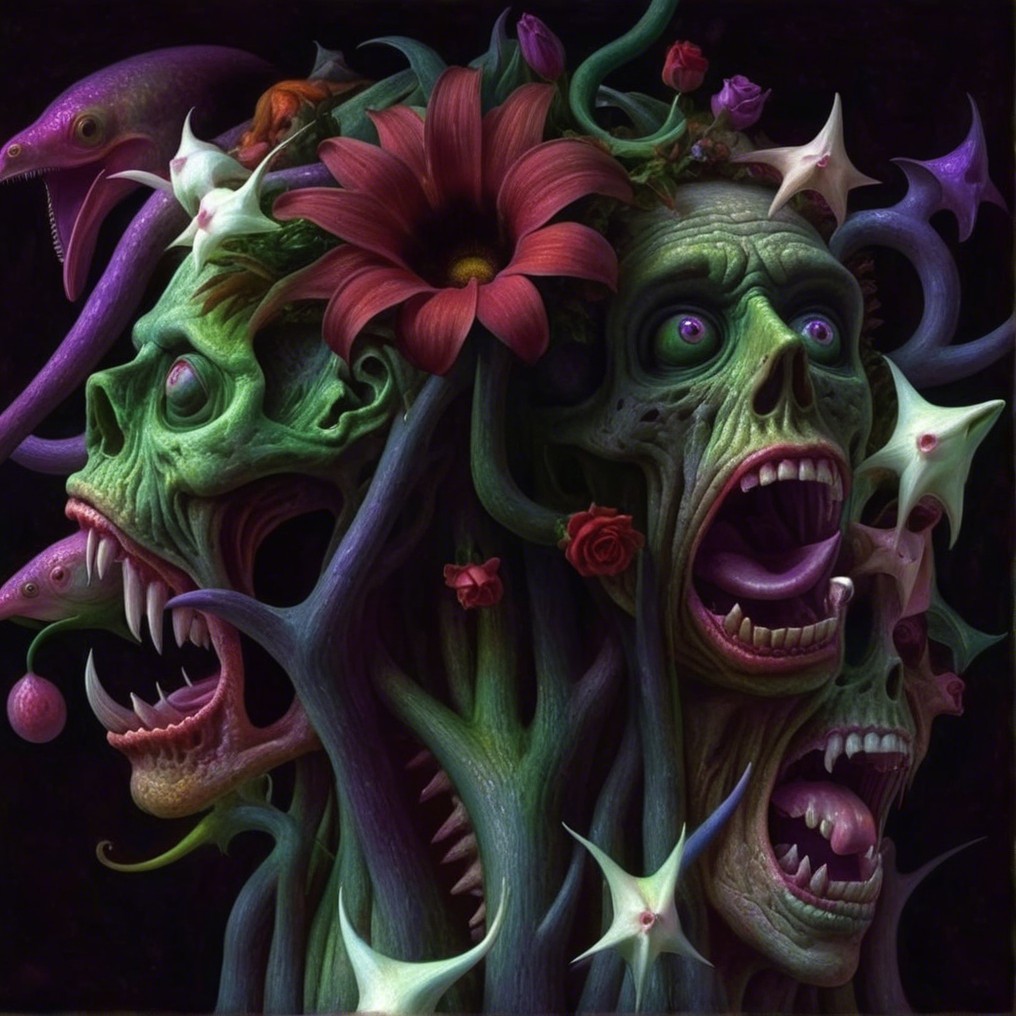 A grotesque creature with multiple eyes, sharp teeth, and vibrant green skin is featured. Horns and tentacles enhance its monstrous appearance, set against a dark, cosmic background.