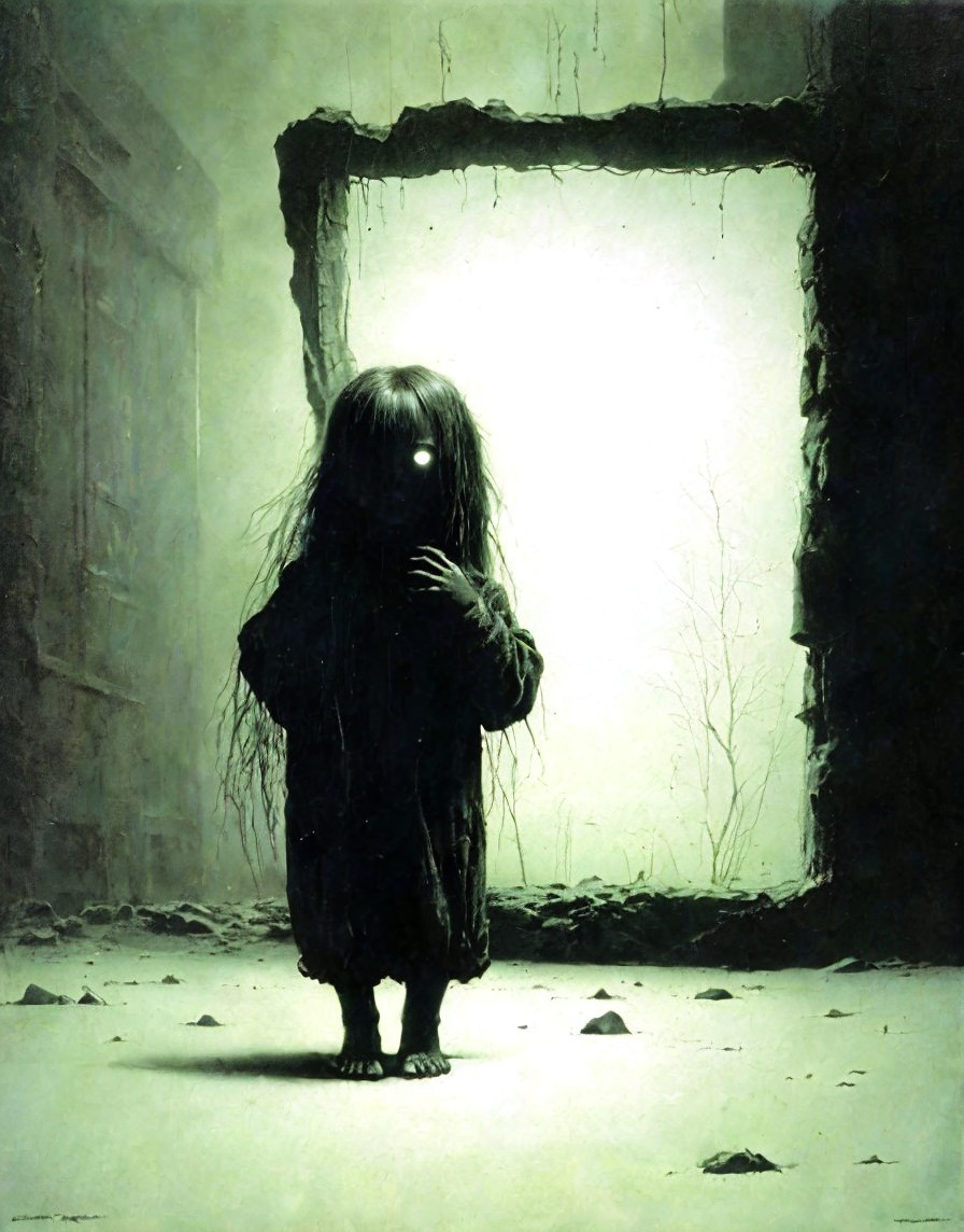 Eerie Figure in Tattered Garment by Glowing Doorway