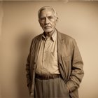 A distinguished older man with gray hair and a beard stands confidently. He wears a beige suit and a white shirt, set against a vibrant, abstract orange and blue background.