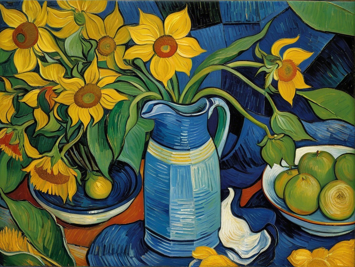 A still life featuring yellow flowers in a blue jug vase alongside a bowl of green apples, set against a textured blue background: bold colours and dynamic brush strokes.