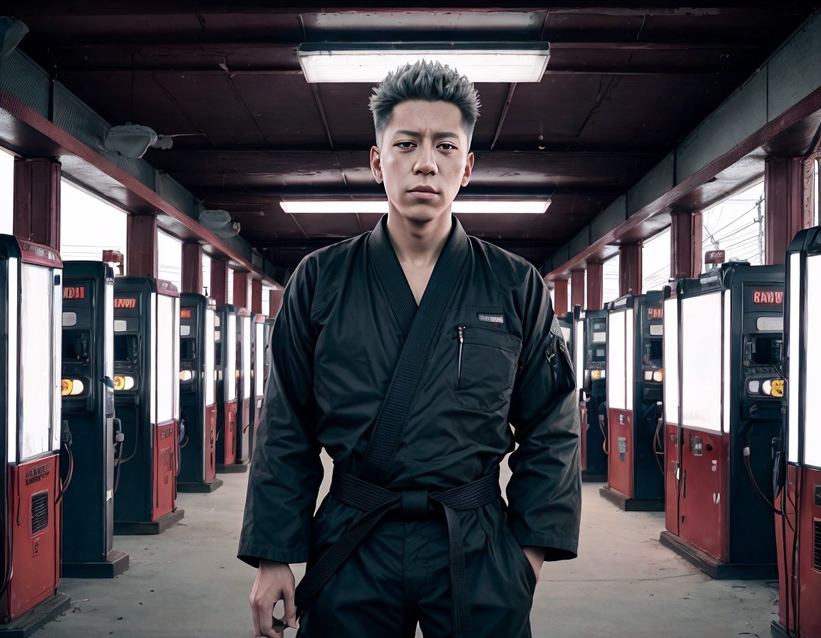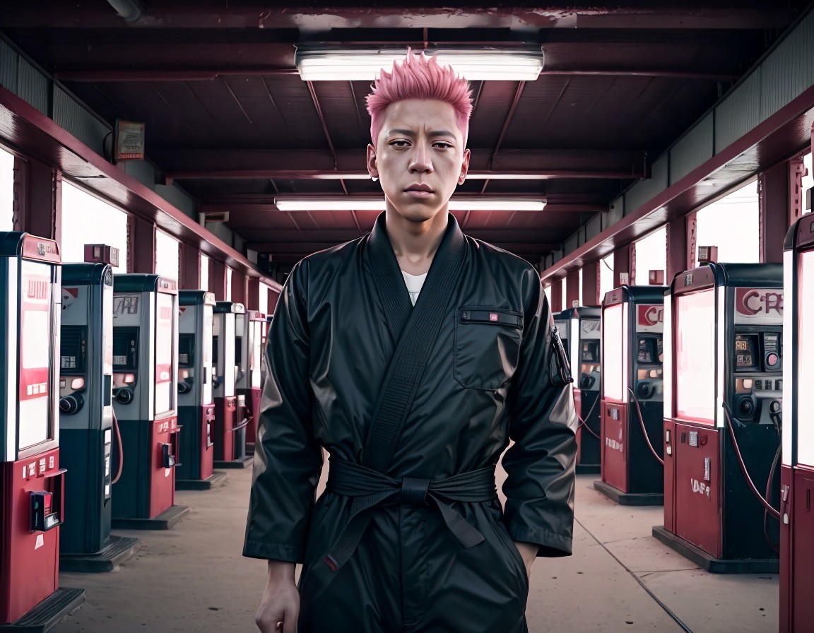 Prompt: Picture of Yuri Itadori from jujutsu kaisen anime as a real person in a vintage american gas station in the middle of a desert in Texas + pink hair + red scarf