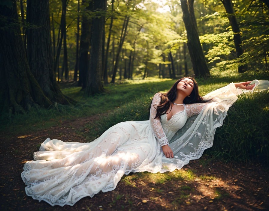 Prompt: "she is laying on the ground and is wearing a long flowing lacey dress, she is in the picture as a complete figure, full body shot in a wide angle shot in the nature,closed eyes, calm, relax, satisfied, happy, wide angel perspective, full body shot , sunny high contrast , soft dynamic lighting , dramatic lighting, excelent view , beautiful sky , high detailed background , dust and particles swirl through the air , high detail"