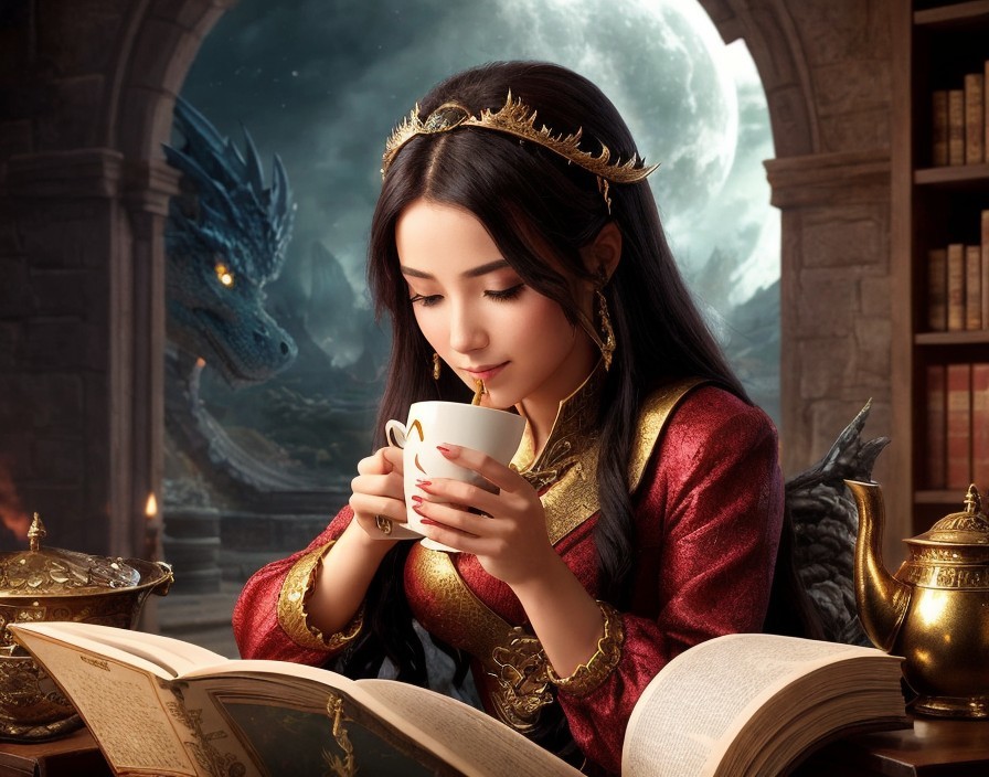 A regal woman with a crown holds a cup, a dragon behind her, amidst books under a moonlit sky.