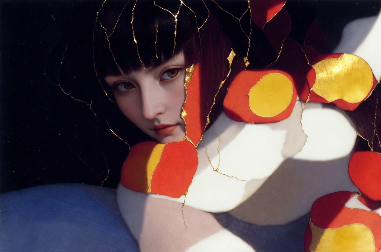 A woman with a striking gaze, adorned in a unique headpiece with gold and red accents, poses against a dark background.