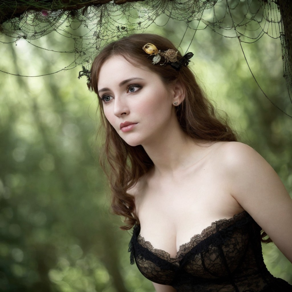 A young woman with braided hair and wearing a black lace garment poses amidst green foliage, gazing to the side under a web-like structure.