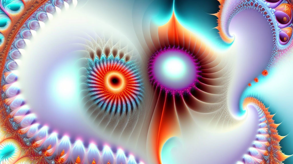 Colorful fractal art: Spirals & circles in pink, blue, purple on pastel backdrop