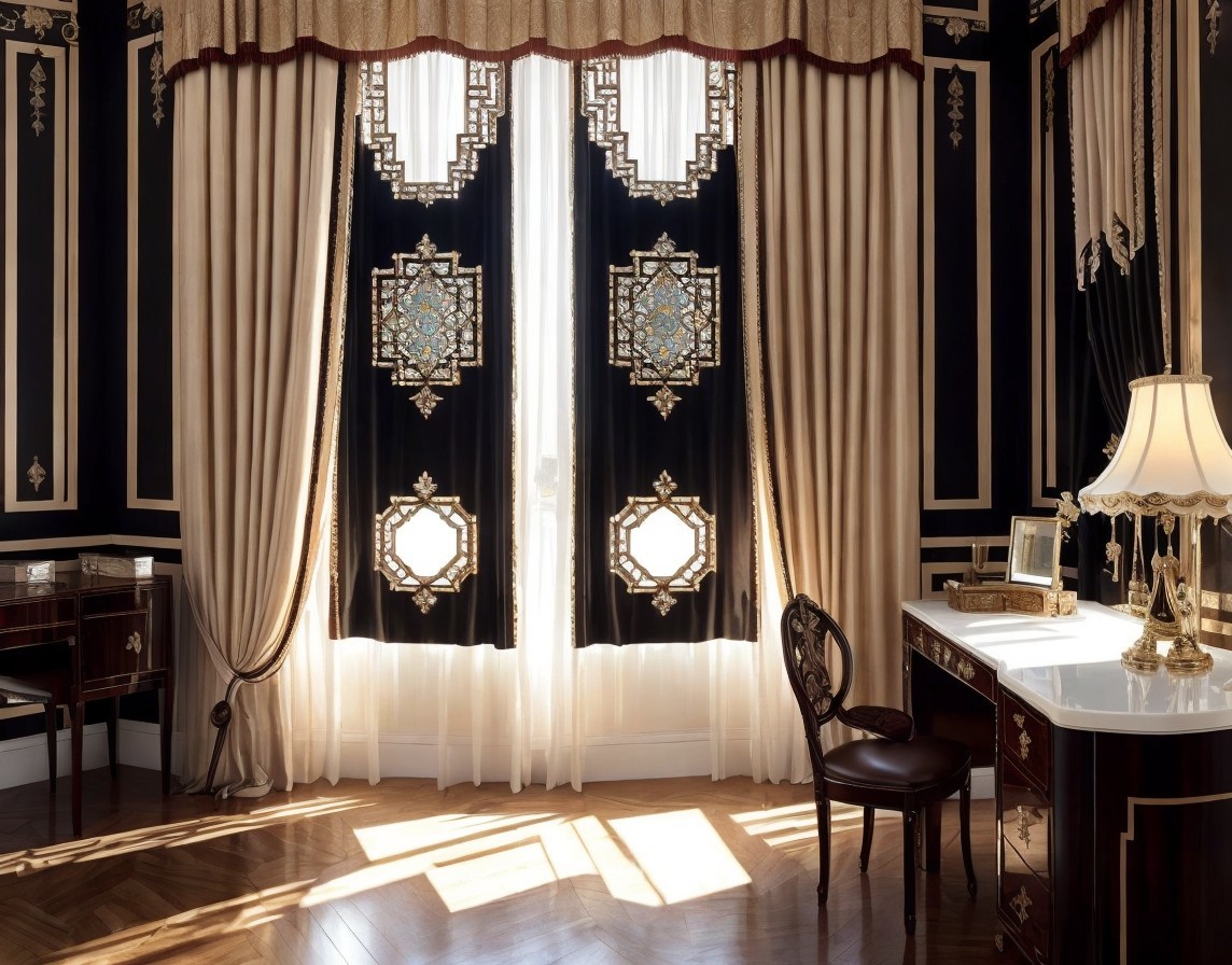 Prompt: Dear AI, please create me an office for one person, arranged in art deco, a lot of wood in warm tone. Bureau and a desk inlaid with a mother of pearl and ivory. Magnificent, decorative curtains in the window.