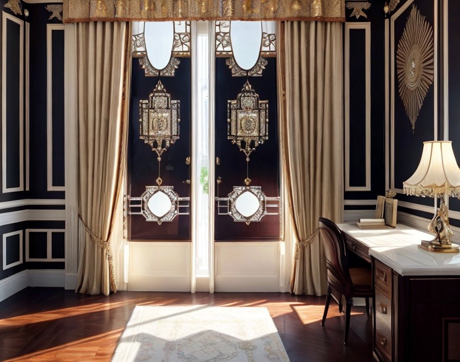 Dear AI, please create me an office for one person, arranged in art deco, a lot of wood in warm tone. Bureau and a desk inlaid with a mother of pearl and ivory. Magnificent, decorative curtains in the window.