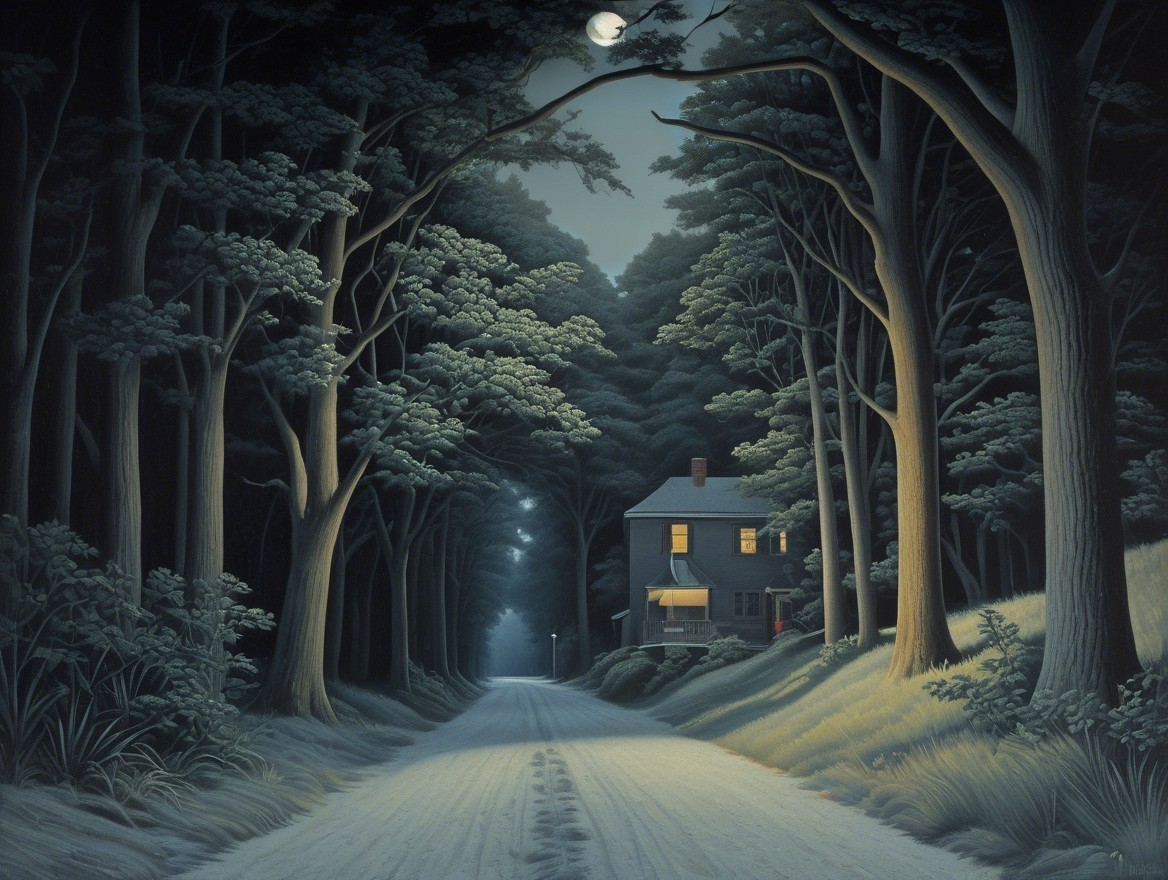 A dimly lit, winding road framed by dark trees under a full moon. Streetlights glow softly, illuminating the path, while a house sits quietly in the background, adding to the serene night atmosphere.