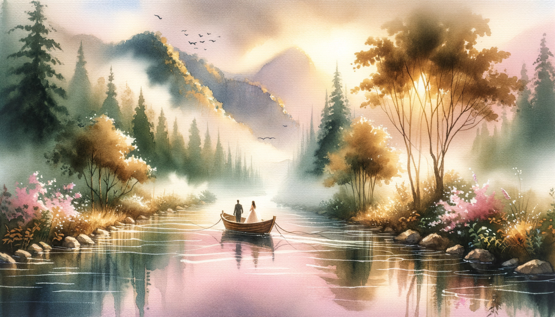 Prompt: "Soft watercolour painting, ethereal and dreamy, minimalistic approach, wet-on-wet technique, loose and breezy brushstrokes, hazy and minimal details, pastel color palette, light and airy feel, lift paint for light and bokeh effects, meandering pink river in a lush golden-green forest, rolling fog in pale autumn hues, serene atmosphere, towering mountains in the background, mirror-like reflections, a quaint wooden boat, subtle water ripples, misty morning setting, soft sunlight filtering through the foliage, fantasy-inspired with intricate and unrealistic details. A couple in the boat, celebrating their wedding anniversary."
