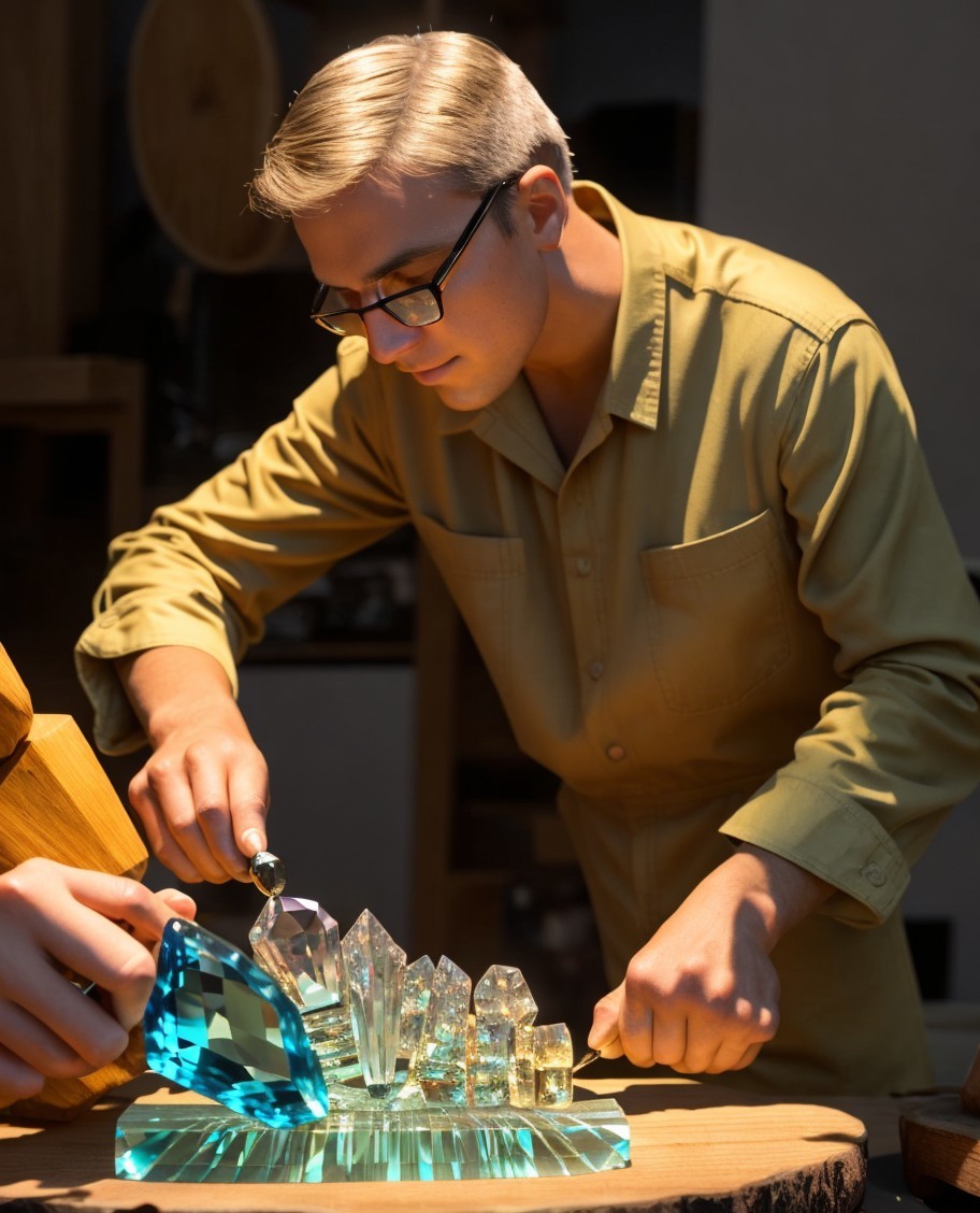 Person Arranging Crystals in Glass Sculpture