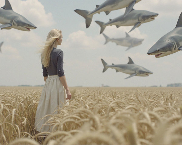 A woman stands in a golden wheat field, gazing up at several sharks floating through the sky, creating a surreal contrast between nature and the unusual scene above her.