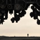 Two silhouetted figures stand on an expanse, gazing up at imposing, futuristic machinery looming above them. The scene is atmospheric, blending technology with a sense of wonder and mystery.