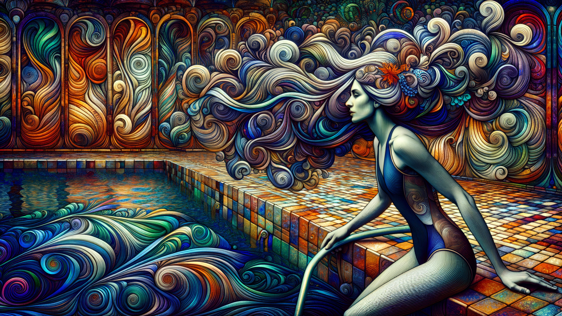 A graceful figure with long, flowing hair floats effortlessly in a shimmering blue pool, wearing a sleek turquoise swimsuit that highlights the vibrant mosaic tiles below.