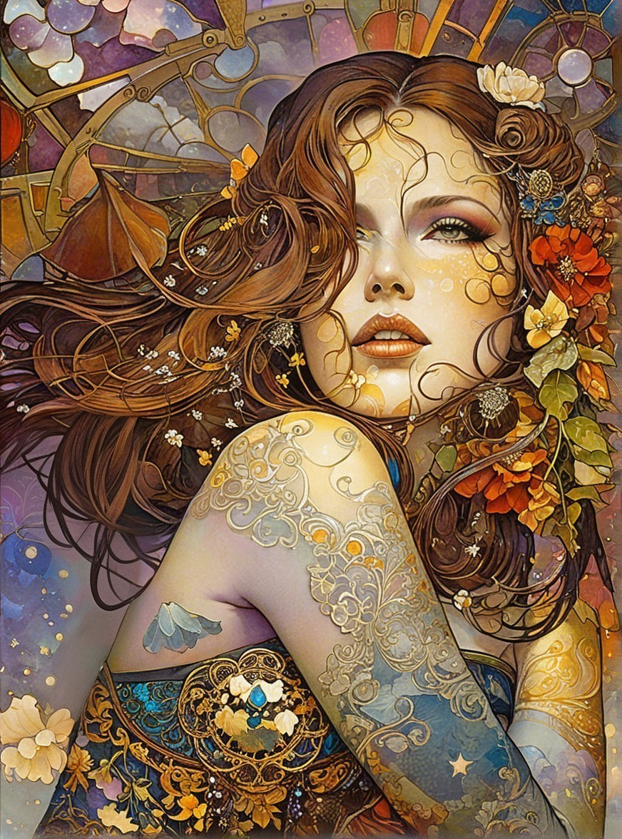 A stunning woman with flowing red hair adorned with flowers gazes intently. Her soft features and elegant attire evoke a sense of fantasy, set against a beautifully detailed art Nouveau