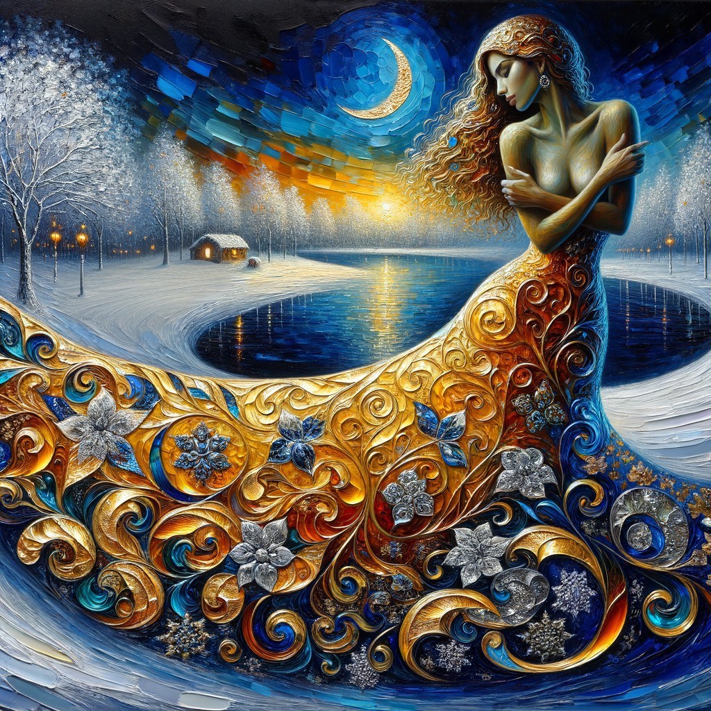 This oil painting depicts a tranquil winter evening, showcasing a woman with flowing gold and blue patterns. She blends into a snowy landscape, illuminated by a crescent moon and stars, with rich textures and vibrant tones.