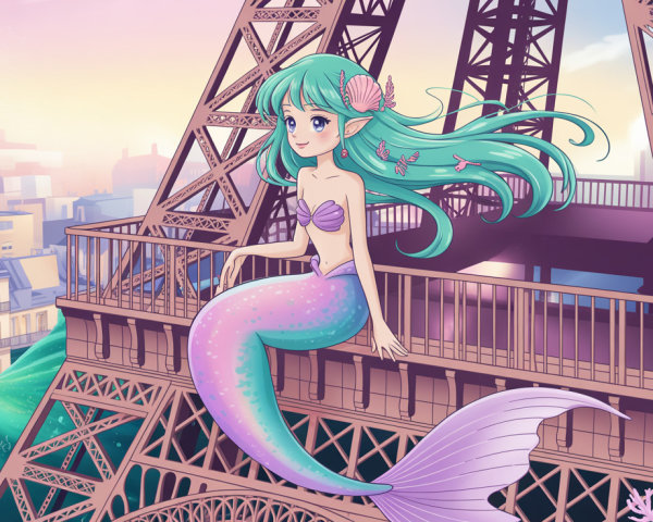 A whimsical anime-inspired grimoire features a charming mermaid, adorned with vibrant scales and flowing hair, surrounded by magical symbols and underwater scenes, blending fantasy and enchantment.