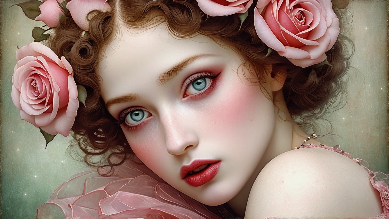 A serene portrait of a young woman with lush, curly hair adorned with pink roses. Her striking blue eyes and soft makeup evoke a romantic, dreamy atmosphere. Soft pastels enhance the ethereal feel.